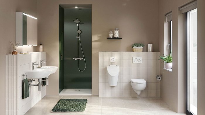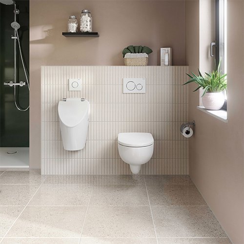Durchgängiges Designkonzept: Die Geberit Renova WC-Keramik mit TurboFlush harmoniert mit dem neuen Renova Urinal S. Passend dazu die Betätigungsplatte Geberit Sigma40 fürs WC und die Urinalsteuerung Typ 40 für das Urinal. Foto: Geberit
